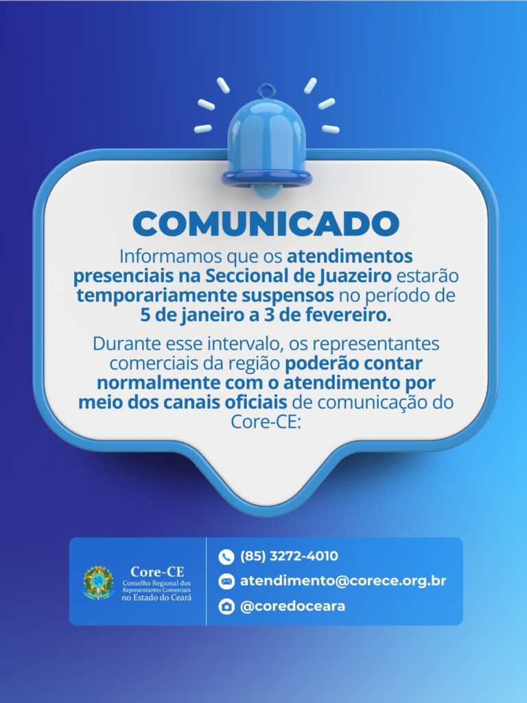 O Conselho Regional dos Representantes Comerciais no Estado do Ceará (Core-CE) informa que os atendimentos presenciais na Seccional de Juazeiro do Norte estarão temporariamente suspensos no período de 5 de janeiro a 3 de fevereiro.